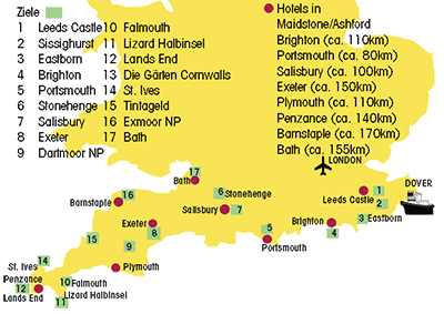 Die größten Sehenswürdigkeiten wie z.B. Leeds Castle, die Abtei von Bath und die Kathedralen von Salisbury und Exeter stehen auf dem Programm. Die großen Naturwunder Dartmoor und Exmoor Nationalpark und nicht zu vergessen die Lizardhalbinsel und Lands End sind ebenso dabei und ein absoluter Höhepunkt ist sicherlich das mystische Stonehenge.