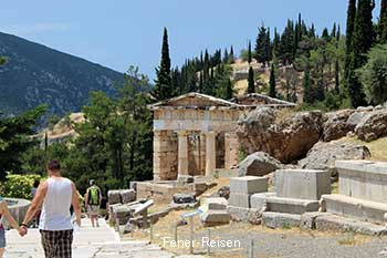 In der Antike reisten sogar Fürsten und Könige nach Delfi, um nicht nur in religiösen, sondern immer mehr auch in politischen Fragen das Orakel zu befragen. Heute sind es die Touristen, die diesen Ort zu einem der wichtigsten und begehrtesten Zielen in Griechenland machen. Dabei ist es nicht nur das grandiose Heiligtum, das es zu bestaunen gibt, sondern auch die wildromantische Umgebung und die Lage am Abbruch des Parnass-Massivs. In der Antike hatte der Ort eine zentrale und weitreichende Bedeutung. Hing von dem Spruch der Orakelpriesterin oft Krieg und Frieden, Leben und Tot ab.