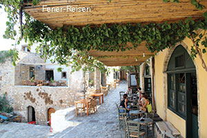 Einer der eindrucksvollsten Orte auf dem Peloponnes ist sicherlich die alte, mittelalterliche Burgstadt Monemvasia auf dem östlichen Finger des Peloponnes. Auf einem riesigen Felsvorsprung gelegen, der bis auf die enge Zufahrt, die durch eine gewaltige Burgmauer mit Burgtor geschützt ist, ist der Ort rundum von Wasser umgeben.