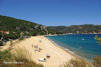Ob an der ruhigeren Westküste, gegenüber vom Festland oder an der etwas rauheren Ostküste zur Ägäis, in jedem Fall genießen Sie ungetrübte Bade- und Strandtage mit glasklarem Wasser und schönen Stränden, teilweise feiner Sandstrand, teilweise Sand- und Kiesgemisch z.B. im Übergang zum Wasser. Da die Orte früher aus Sicherheitsgründen immer höhergelegen waren, sind es heute kleine Siedlungen der Touristik, die direkt am Strand liegen. Von den traditionellen Orten führt dann in der Regel ein Sträßchen hinunter zum Wasser.