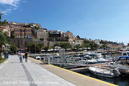 Das Herzstück der Stadt ist aber der Hafen mit einem Fußgängerbereich entlang der Hafenpromenade. Sehr markant auch das türkische Aquädukt, das früher der Wasserversorgung der Stadt diente. In der Stadt befindet sich eines der imposantesten, allerdings auch teuersten Hotels des Landes im historischen Imaret.