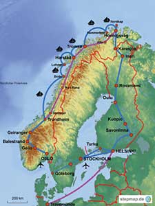Finnland: (Helsinki) - Savonlinna/Seenumgebung oder Hüttenaufenthalt in Finnland - Kuopio - Oulu - Rovaniemi - Inari - Norwegen: Karasjok - Nordkap/Honnigsvåg - Alta - TromsØ - Harstad - Mo i Rana - Steinkjer - Trondheim - Geiranger - Balestrand - Geilo - Oslo