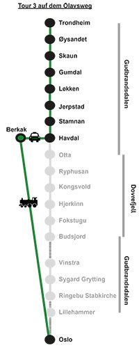 Die Tour beginnt in Berkåk, das Sie per Bahn ab Oslo erreichen können oder direkt im Havdal Gästehaus. Von der Bahnstation ist ein Transfer zur ersten Unterkunft möglich. Zusammen mit der Bahnfahrt ab Oslo bieten wir dies als optionalen „Anfahrtbaustein“ an.