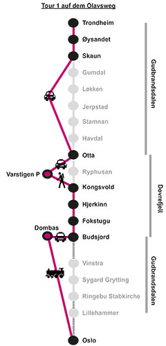 Die Tour beginnt in Dombas, das Sie per Bahn ab Oslo erreichen können. Von der Bahnstation ist ein Transfer zur ersten Unterkunft notwendig. Übernachtung in Oslo, Bahnfahrt und Transfer bieten wir in einem optionalen Anfahrtbaustein an. Sie wählen zwischen der einfachen Pilgerunterkunft in Mehrbettzimmern ohne Verpflegung (eigner Schlafsack ist notwenig) oder den komfortableren, Unterkünften im Hotelstil mit Abendessen, Frühstück und Lunchpaket (Ausnahme, die Fokstugu). Statt der Fokstugu können wir Ihnen gegen Aufschlag die Dovrefjell Lodge mit Verpflegung anbieten, dafür würde die erste Tagesetappe aber ein paar Kilometer länger werden. Optional ist ein täglicher Gepäcktransport inklusive, sodass Sie nur mit einem Tagesrucksack wandern können. Der längere Taxitransfer (gut 100km) am Ende der Dovrefjellüberquerung zum letzten Abschnitt, der Wanderung vor Trondheim, ist ebenfalls inklusive. Und schließlich erhalten Sie den Pilgerpass von uns. Insgesamt 7 Übernachtungen, in der Kategorie Pilgerunterkünfte ist ein eigener Schlafsack/Handtücher mitzubringen.