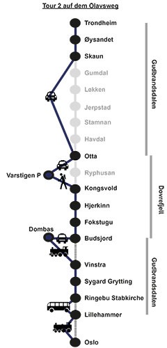 Der erste Tourabschnitt beginnt in Lillehammer mit einer Übernachtung. Am nächsten Tag Fahrt mit dem Zug oder Bus nach Ringebu zur berühmten Stabkirche. Beginn der Wanderung auf dem Olavsweg. Übernachtung auf Sygård Grytting, in der besseren Kategorie inklusive aller Mahlzeiten. Nächste Übernachtung in Vinstra, Übernachtung/Frühstück dort. Am Folgetag Bahnfahrt nach Dombas und Transfer in den Pilegrimsgarden von Budsjord. Ab Budsjord Programm wie in Tour 1 bzw. der Kombitour 2 und 3.